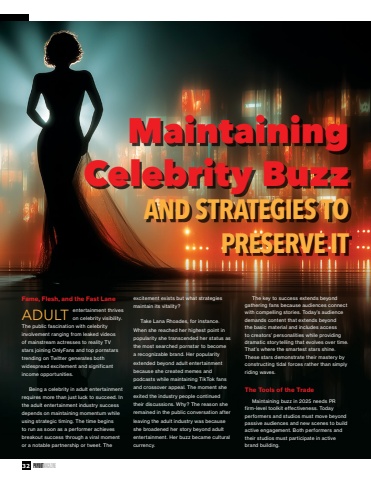 32PAYOUTMAGAZINEFame, Flesh, and the Fast LaneADULTentertainment thrives on celebrity visibility. The public fascination with celebrity involvement ranging from leaked videos of mainstream actresses to reality TV stars joining OnlyFans and top pornstars trending on Twitter generates both widespread excitement and significant income opportunities.Being a celebrity in adult entertainment requires more than just luck to succeed. In the adult entertainment industry success depends on maintaining momentum while using strategic timing. The time begins to run as soon as a performer achieves breakout success through a viral moment or a notable partnership or tweet. The Maintaining Celebrity BuzzAND STRATEGIES TO PRESERVE ITexcitement exists but what strategies maintain its vitality?Take Lana Rhoades, for instance. When she reached her highest point in popularity she transcended her status as the most searched pornstar to become a recognizable brand. Her popularity extended beyond adult entertainment because she created memes and podcasts while maintaining TikTok fans and crossover appeal. The moment she exited the industry people continued their discussions. Why? The reason she remained in the public conversation after leaving the adult industry was because she broadened her story beyond adult entertainment. Her buzz became cultural currency.The key to success extends beyond gathering fans because audiences connect with compelling stories. Today%u2019s audience demands content that extends beyond the basic material and includes access to creators%u2019 personalities while providing dramatic storytelling that evolves over time. That%u2019s where the smartest stars shine. These stars demonstrate their mastery by constructing tidal forces rather than simply riding waves.The Tools of the TradeMaintaining buzz in 2025 needs PR firm-level toolkit effectiveness. Today performers and studios must move beyond passive audiences and new scenes to build active engagement. Both performers and their studios must participate in active brand building.
