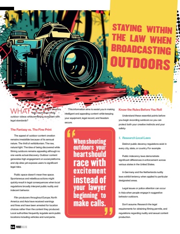 34PAYOUTMAGAZINEWHATsteps can content creators take to produce erotic outdoor videos while remaining compliant with legal standards?The Fantasy vs. The Fine PrintThe appeal of outdoor content creation remains irresistible because of its sensual nature. The thrill of exhibitionism. The raw, natural light. The idea of being discovered while filming outdoors remains appealing although no one wants actual discovery. Outdoor content generates high engagement on social platforms and clip sites yet exposes users to significant legal risks.Public space doesn%u2019t mean free space. Spontaneous and rebellious actions might quickly result in legal consequences when local regulations broadly interpret public nudity and indecent behavior.Film producers throughout Europe, North America and Asia have received warnings and fines and have been arrested for location choices rather than the content they produced. Local authorities frequently regulate semi-public locations including vehicles and rural parks.This information aims to assist you in making intelligent and appealing content while keeping your equipment, legal record, and freedom secure.STAYING WITHINTHE LAW WHEN BROADCASTING OUTDOORSKnow the Rules Before You RollUnderstand these essential points before you begin recording outdoors so you can protect both your creative instincts and your safety:1.Research Local LawsDistinct public decency regulations exist in every city, state, or country. For example:Public indecency laws demonstrate significant differences in enforcement across various states in the United States.In Germany and the Netherlands nudity laws exhibit leniency when applied to particular designated areas.Legal issues or police attention can occur in Asia when people engage in suggestive behavior outdoors.Don%u2019t assume. Research the legal requirements for obtaining filming permits, and regulations regarding nudity and sexual content production.When shooting outdoors your heart shouldrace withexcitementinstead of your lawyerbeginning to make calls.