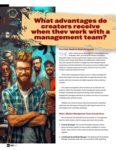 44PAYOUTMAGAZINEFrom Solo Hustle to Smart DelegationTHEadult content space offers creators independence which empowers them, yet that same freedom can lead to exhaustion. Many creators launch their careers as one-person shows: Creators write scripts while filming and editing their content which they then upload and market to engage fans and manage financial transactions all while maintaining their presence across multiple media platforms. Creative careers face a major threat from burnout which remains a quiet yet destructive force.That%u2019s where management teams come in. Today%u2019s management teams stand apart from past shady DVD era agencies because they operate with lean structures and digital expertise while prioritizing creators.The optimal management team functions as an enhancer who supports rather than dominates. Good management teams provide strategic scheduling and brand partnerships while handling fan engagement and legal protections so creators can focus on producing compelling high-earning content.Visibility now carries immense importance because competition exists just one click away so having the right support team isn't an extravagance but a strategic advantage.What a Modern Management Team Actually DoesWe will examine the essential functions present in a management team for adult creators and the unique value each role provides.1.Content Strategist: The Content Strategist develops content plans and tracks analytics to help creators capitalize on current trends. They function as the unseen producers steering everything together.2.Marketing & Social Media Manager: The Marketing & Social Media Manager schedules posts and runs promotions while optimizing What advantages do creators receivewhen thev work with a management team?