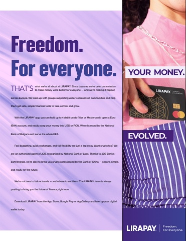 PAYOUTMAGAZINE5THAT%u2019Swhat we%u2019re all about at LIRAPAY. Since day one, we%u2019ve been on a mission to make money work better for everyone %u2014 and we%u2019re making it happen across Europe. We team up with groups supporting under-represented communities and help them get safe, simple financial tools to take control and grow.With the LIRAPAY app, you can hold up to 4 debit cards (Visa or Mastercard), open a Euro IBAN account, and easily swap your money into USD or RON. We%u2019re licensed by the National Bank of Bulgaria and serve the whole EEA.Fast budgeting, quick exchanges, and full flexibility are just a tap away. Want crypto too? We are an authorised agent of JDB, recognised by National Bank of Laos. Thanks to JDB Bank%u2019s partnerships, we%u2019re able to bring you crypto cards issued by the Bank of China %u2014 secure, simple, and ready for the future.We%u2019re not here to follow trends %u2014 we%u2019re here to set them. The LIRAPAY team is always pushing to bring you the future of finance, right now.Download LIRAPAY from the App Store, Google Play or AppGallery and level up your digital wallet today.Freedom.For everyone.