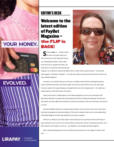 8PAYOUTMAGAZINESummer is upon us %u2014 though it seems the season can%u2019t quite make up its mind. Some of us are still chasing the elusive sun, contemplating whether a canoe might be the best way to navigate the endless rain, while others are sweltering under blazing skies, clinging to air conditioners and fans like lifelines. But no matter where you find yourself %u2014 sun-drenched, water-logged, or somewhere in between %u2014 we invite you to take a well-deserved break and dive into this new issue of PayOut Magazine.As always, it%u2019s our absolute pleasure to bring you a carefully curated collection of thought-provoking articles, captivating interviews, and timely insights. Our team has poured heart and soul into every page, striving to capture the energy, challenges, and opportunities of our ever-changing world %u2014 all to offer you a reading experience that both informs and inspires.Inside, you%u2019ll discover in-depth features on the latest developments, one-on-one conversations with fascinating individuals, and explorations of emerging trends that are shaping the landscape. We hope each piece sparks new ideas, offers fresh perspectives, and leaves you feeling a little more connected to the pulse of our times.You%u2019ll find Spotlight Interviews on leading industry experts, news and reviews on the most recent events and plenty of engaging and educational features. Check out the important topics, such as how collaborating with PayOut Magazine provides huge benefits for you and your company. Thank you, as always, for your loyal support and for being part of our growing community. We hope you enjoy reading this issue as much as we loved creating it. And of course, if there%u2019s something you%u2019d like to see in future editions, don%u2019t hesitate to reach out %u2014 your feedback is the heartbeat of PayOut Magazine.We are already looking forward to the next edition, which promises to be even bigger and better. Until then %u2026%u2026%u2026%u2026EDITOR%u2019S DESK Welcome to the latest edition of PayOut Magazine %u2013 the FLIP is BACK!